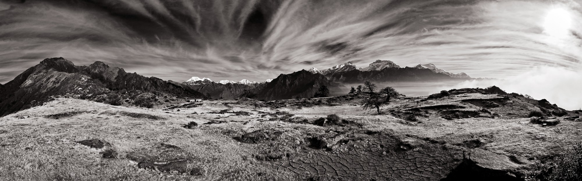 Sundar Kharka is one of the great finds of my Himalayan adventures. A lonely shelf on a high ridge, surrounded by a sea of mountains and clouds, scattered about with wind whipped trees and primitive kharkas. The word kharka means "shelter" and the area is used for pasture in the rainy months when the animals go up high. It was dry as a bone and deserted when we passed through in the winter of 2009.